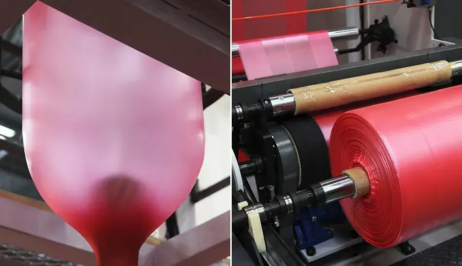 Estrusione: i granuli di polimero miscelati vengono portati alla temperatura di plastificazione da appositi macchinari (estrusori) e tramite il processo di filmatura per soffiaggio vengono trasformati in bobine.